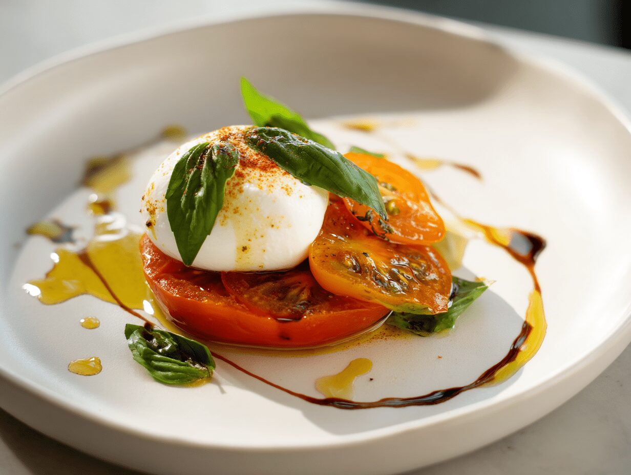 Imagine a platter bathed in natural light: torn pillows of burrata, their creamy centers spilling gently over vibrant cherry tomatoes. Fresh basil leaves peek out like tiny green flags of summer. A glisten of rich olive oil catches the eye, while a syrupy drizzle of balsamic reduction clings lovingly to every curve.