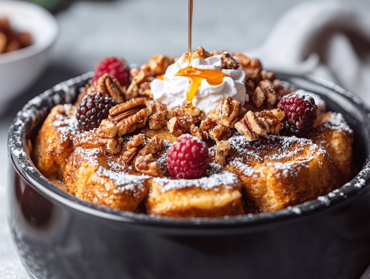 Golden brioche soaked in spiced custard, slow-cooked to a gooey center with a caramelized crumble top — and yes, we topped it with whipped cream, syrup, pecans, and powdered sugar.