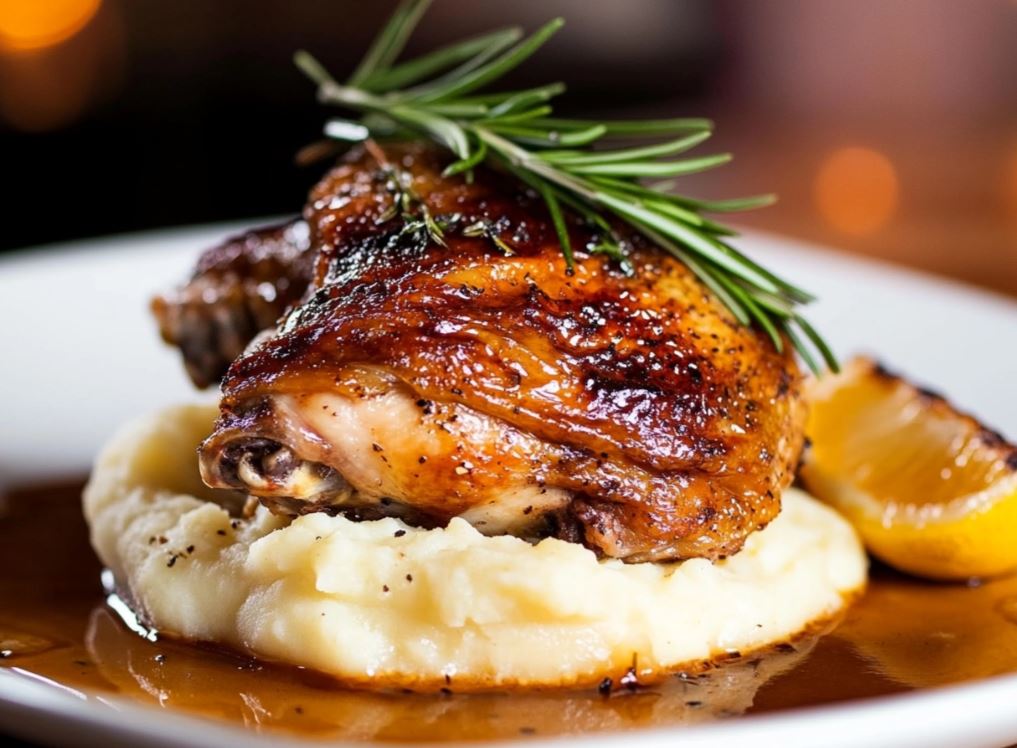 Serve roasted chicken over garlic mashed potatoes, garnished with lemon slices and fresh rosemary.